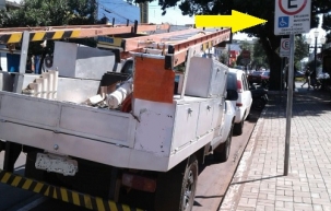 Av. Capitão Índio Bandeira, no calçadão de Campo Mourão. Caminhão estaciona em vaga destinada a portadores de deficiência.