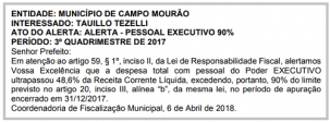 O Tribunal de Contas do Estado publicou nesta terça-feira alerta para o prefeito Tauillo Tezelli. Segundo o TC, a administração encerrou 2017 gastando 48,5% da receita corrente líquida com a folha de pagamento, o que acende o sinal amarelo. É o primeiro alerta "100% tauillista", já que os anteriores incluiam meses da gestão Regina Dubay.