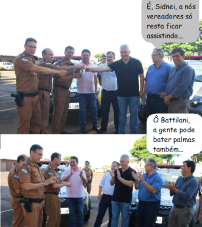 Os cliques são da entrega de três viaturas para o 11.o BPM, nesta sexta-feira. O deputado Márcio Nunes, o prefeito Tauillo Tezelli e o secretário Douglas Fabrício fizeram a clássica posse do repasses das chaves para os policiais, enquanto os vereadores Edson Battilani e Sidnei Jardim ficaram de lado, só observando...