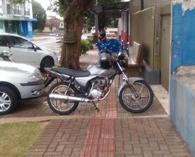 O pedestre está andanddo pela calçada e, de reprente, se depara com uma cena como essa, como em Campo Mourão, seja com moto, seja com carros. Como fazer? Desviar pelo meio da rua (reparece que na beiradinha da rua não dá porque há carros estacionados). Agora imagine uma criança indo para a escola, uma mãe com carrinho de bebê, um cadeirante...