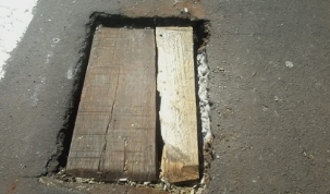 Jeitinho brasileiro no bueiro que teve a tampa quebrada na esquina da av. Irmãos Pereira com a rua Harrison José Borges, centro de Campo Mourão.
