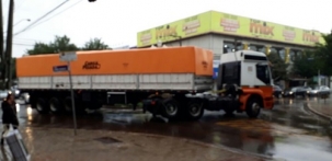 Na manhã desta sexta-feira, carreta passa pela av. Capitão Índio Bandeira e vira na rua São Paulo, centro de Campo Mourão.