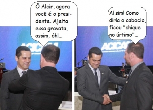 Os cliques são de sexta-feira, no Celebra, durante a posse festiva da nova diretoria da Acicam. O ex-presidente Paulo César Gomes passou o "bótom presidencial" para Alcir Rodrigues da Silva (a gravata citada no balãozinho é só "liberdade poética" deste Site). O evento teve a presença da governadora Cida Borghetti.