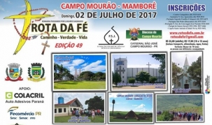 Atenção, romeiros! Estão abertas as inscrições para a 49.a Rota da Fé, que será realizada dia 2 de julho. O percurso desta vez será entre Campo Mourão e Mamborê, onde serão visitados a igreja matriz e três capelas. A inscrição custa R$ 35, com direito a ônibus e alimentação. Quem tem de 10 a 15 anos paga só R$ 17. Menos de 10 anos não pagam. Inscrições no Centro Catequético - (44) 3525-1634.