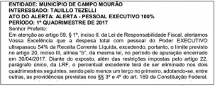 ...Campo Mourão! O Tribunal de Contas do Estado publicou nesta terça-feira o que todo mundo já sabia: que a prefeitura de Campo Mourão encerrou o primeiro quadrimestre do ano estourando os limites legais nos gastos com a folha de pagamento. Aí vem o puxãozinho de orelha de sempre: o prefeito Tauillo Tezelli tem de tomar as medidas para regularizar a situação. A prefeitura diz que já vem fazendo isso desde o ínício de janeiro.