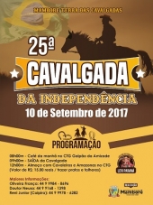 Mamborê - A prefeitura vai promover dia 10 de setembro a 25ª Cavalgada da Independência. O tradicional evento é uma das maiores cavalgadas do Estado e faz parte da programação da 34ª Expomam, que este ano comemorará os 57 anos do município.