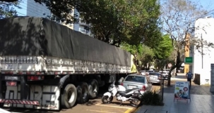 Carreta passa pela av. José Custódio de Oliveira, perto no Banco do Brasil, no centro de Campo Mourão. A avenida ficou estreita com o estacionamento liberado dos dois lados e mesmo assim os caminhões conseguem passar.