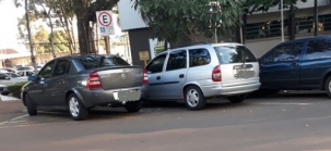 Rua Brasil, em frente à prefeitura. Um dos carros estava estacionado fora da área demarcada, portanto, irregularmete. O outro, na vaga de deficientes, usava o cartão virado, ou seja, não dava para ver se era o cartão correto. Essa prática está sendo constante.