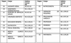 Os salários vão de R$ 937 (ajudante geral) e R$ 6,1 mil (médico).