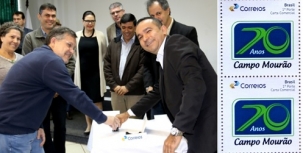 Agora é oficial. Os 70 anos de Campo Mourão, que serão completados em outubro, viraram selo dos Correios. O lançamento aconteceu nesta segunda-feira, na prefitura, em evento com a presença do prefeito Tauillo Tezelli. O selo reproduz a logomarca dos 70 anos escolhida através de concurso e já está circulando a partir das correspondências oficiais. Também estão sendo disponibilizados para filatelistas interessados.
