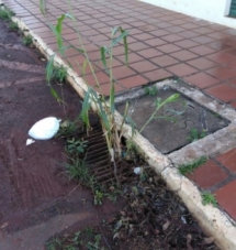 "Bueiro wntupido com com pé de milho. Será que é uma nova tática da prefeitura para aproveitar o bueiro que não funciona para recolher água? Fica na av. Afonso Botelho esquina com rua Araruna".