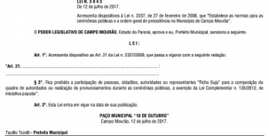 O prefeito Tauillo Tezelli sancionou a lei que proibe quem tem "ficha" suja de compor mesa de honra em eventos oficiais.