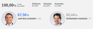 Fez 67,56% dos votos, contra 32,44% de Fernando Haddad (34.383 a 16.510 em número de votos).