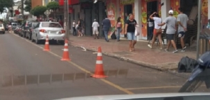 "Em pleno sábado, às 11h50, em período natalino, loja coloca cones para reserva de vaga, no centro de Campo Mourão. Lembrando que se o motorista estaciona seu carro no horário de carga e descarga, leva multa".