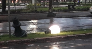 O poste republicano foi derrubado já há alguns dias, mas a lâmpada teima em acender à noite, mesmo no chão. Fica na av. Irmãos Pereira, perto da Estação da Luz.