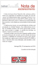 "Nota de esclarecimento" confirma a suspensão da moagem de cana-de-açúcar nas safras de 2019 e 2020.