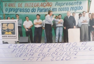 Olha a postagem do ex-prefeito Nelson Tureck. Ele achou a foto, com anotação e tudo, do lançamento do Anel de Integração, em 1998. Anotação diz que as duplicações de Campo Mourão e Maringá e a Cascavel estariam prontas "até 2010". Estamos no final de 2018 e uma segue incompleta e outra nem vai sair mais. "Vamos cobrar, minha gente", escreveu Tureck.