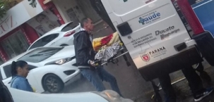 "Paciente é colocado em ambulância debaixo de chuva em hospital no centro de Campo Mourão. Infelimente a cena tem sido comum".