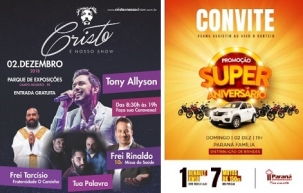 2) O Paraná Supermercados realiza às 11h o sorteio da promoção Super Aniversário. Será às 11h no Paraná Família. Tem um carro e sete motos 0 km. Haverá brindes para quem companhar o sorteio.