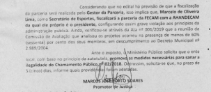O principal problema seria o secretário Marcelo Lima (Esportes) constar com presidente da Ahandecam.