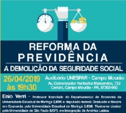 1) "Reforma da Previdência: A demolição da seguridade social" será o tema de seminário que o deputado federal Ênio Verri profere nesta sexta-feira (19h30) na Unespar/CM. Ele é professor de economia licenciado da UEM.
