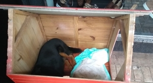 Cachorro de rua dorme em casinha colocada por lojista no calçadão, que teve parte da cobertura quebrada.