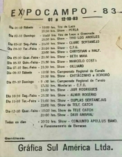 Em época de Expoingá, em Maringá, a gente lembra de quando Campo Mourão tinha a Expocampo. Começou em 1980, quando nem o Parque de Exposições existia, e foi até 2002. O panfleto acima mostra a programação da Expocampo de 1983, de 1 a 12 de outubro. Isso mesmo: 12 dias! Entre os shows, Perla, Chitãozinho & Xororó, Jair Rodrigues, Christian & Ralf, Gilliard e Almir Rogério (aquele, do "Fuscão Preto").