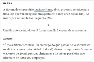 As longas filas em busca de emprego em futuras lojas da Havan foram temas de notas na Folha de S. Paulo desta sexta-feira. Foi na coluna de Monica Bergamo. Só não se refere a Campo Mourão, não. Fala só de Santa Cruz do Sul/RS, onde a rede também deve chegar em agosto. Assim como cá, a fila lá também começou na véspera da distibuição das senhas.