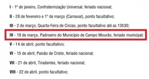 Lembra que a prefeitura de Campo Mourão tinha definido em decreto todos os feriados e recessos ao longo do ano, mas se esquecendo do 19 de março, que é dia São José? Nesta sexta-feira o decreto foi republicado, com a devida citação do dia do santo padroeiro do município. Portanto, a administação não precisa mais pagar penitência, precisa?...