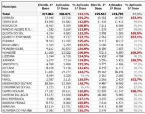 Estão abaixo dos 100%, na primeira dose, apenas Fênix (92,4%) e Corumbataí do Sul (96,4%).