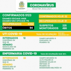 Campo Mourão voltou a confirmar neste sábado mais 32 casos de covid-19. Os recuperados foram 31. O número de suspeitos subiu para 225. O índice de ocupação de leitos na UTI ficou em 66%, tanto no SUS como nos convênios. O índice é maior na enfermaria: 92%.