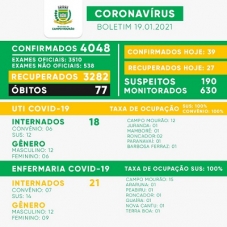 Boletim desta terça-feira traz mais 39 casos de covid-19 em Campo Mourão. O número de moradores com o vírus ativo subiu para 689. A ala covid da Santa Casa está lotada tanto na UTI como na enfermaria. São 12 leitos do SUS e seis de convênios na unidade de terapia intensiva e 21 na enfermaria.