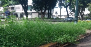 A prefeitura ao fundo não deixa dúvidas: é centro de Campo Mourão. E o mato tá alto em trechos do canteiro da av. Manoel Mendes de Camargo.