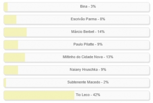 Dos novos vereadores eleitos em Campo Mourão, quem te surprendeu mais? Enquete teve votação encerrada neste domingo. Tio Leco venceu com folga. Teve 42% dos votos. Márcio Berbet ficou sem segundo (14%) e Miltinho do Cidade Nova em terceiro (13%). Já o Subtenente Macedo teve apenas 2% dos votos e, pelo visto, era esperado. O resultado completo está no quadro acima.