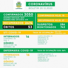 Domingo de "poucos" casos confirmado de covid-19 em Campo Mourão. Foram 18. O número de recuperados foi maior: 27. Com isso, o número de moradores com o vírus ativo caiu para 523. A taxa de ocupação na UTI Covid também caiu (92%), com 11 dos 12 leitos do SUS ocupados. Ao todo, há 37 pessoas internadas - 18 na UTI e 19 na enfermaria.