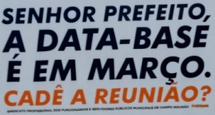 A prefeitura de Campo Mourão ainda não marcou reunião com o Sindicato dos Servidores para discutir a data-base da categoria. O pedido para um encontro foi feito no mês passado. A data-base é em este mês. "Cadê a reunião?", questionou o Sindiscam nas redes sociais. Os servidores querem 7,5% de reajuste salarial, mas a pauta de reivindicações tem vários outros itens.