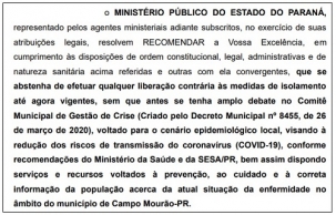 O Ministério Público de Campo Mourão expediu recomendação nesta sexta-feira ao prefeito Tauillo Tezelli.