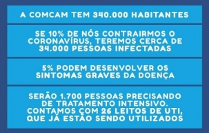 A prefeitura de Campo Mourão postou em redes sociais uma arte em que explica porque a população deve ficar em casa. Leva em conta que os 340 mil moradores da região (25 municípios), se não houver o isolamento social, podem precisar de 1.700 leitos de UTI. Campo Mourão tem apenas 26.