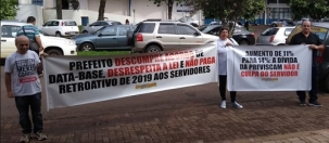 O Sindicato dos Servidores Municipais protestou nesta segunda-feira em frente ao Teatro Municipal.