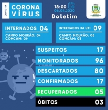 Em Campo Mourão, 18 horas. Hora da prefeitura apresentar novo boletim do coronavírus. Nesta segunda-feira o número de óbitos ficou no mesmo - três. Ufa. Mas os casos confirmados subiram de 14 para 17 e os suspeitos de 10 para 17. O número de internados na UTI também subiu de 8 para 9 (três são da região). Os monitorados caíram de 110 para 96 e os recuperados foram de 4 para 5.
