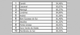 A melhor cidade da região é Mamborê, que ficou em 11° no Paraná.