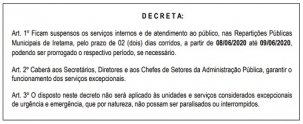 O prefeito de Iretama, Wilson Bratac, assinou mais um decreto neste domingo com medidas de enfrentamento ao covid-19. Agora foi para fechar da prefeitura por dois dias. Segunda e terça-feira não tem nem expediente interno. O prazo pode ser prorrogado. Na sexta-feira um decreto já tinha determinado o fechamento do comércio e de igrejas por quatro dias. As medidas foram tomadas após a confirmação de novos casos de coronavírus no município.