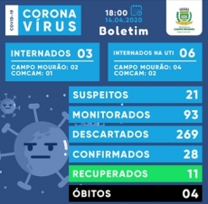 Depois de dois dias "zerados", Campo Mourão voltou a confirmar casos de Covid-19, que foram de 26 para 28. Em compensação, os suspeitos, que chegaram a 132, despencqram para 21 (eram 60 no dia anterior). Os recuperados subiram de nove para 11. Na UTI se manteve o mesmo número de leitos ocupados com o coronavírus: seis. Também não houve alteração no número de mortes (quatro).