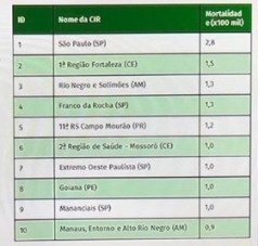 O índice na área da 11ª Regional de Saúde é de 1,2 morte para cada 100 mil habitantes.