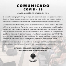 Igreja Calvary Campo, de Campo Mourão, em comunicado divulgado nesta quinta-feira, sobre continuarem suspensos os cultos e encontros presenciais. "Cremos em uma fé racional, cívica e responsável que opera através do amor a Deus e ao próximo", destaca.