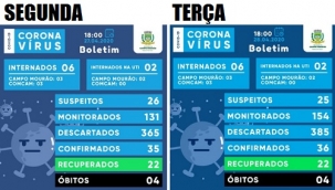 Mais um caso de coronavírus foi confirmado em Campo Mourão nesta terça-feira. Agora são 36. Desse total, 22 estão recuperados, quatro morreram, dois estão na UTI, três na enfermaria e cinco estão em tratamento em casa. O boletim desta terça mostra aumento nos casos monitorados de 131 para 154.