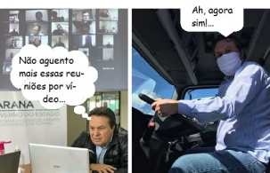 Os cliques são das redes sociais do secretário de Estado Márcio Nunes. Primeiro ele aparece participando de reunião por videoconferência, que virou padrão em tempos de coronavírus. Depois, simula dirigir um caminhão durante entrega, semana passada, de caminhões e viaturas em evento do governo estadual.