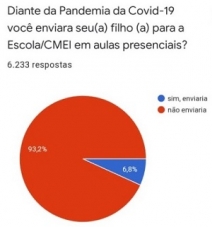 A Secretaria de Educação de Campo Mourão encerrou a enquete com as famílias dos sobre a volta da aulas presenciais. Resultado? Mais de 6,2 mil pais e responsáveis votaram e 93,2% disseram que não enviariam seus filhos para a escola. Apenas 6,8% estão dispostos a mandar as crianças para as aulas presenciais. O resultado será usado na organizado do plano de contingência da secretaria.