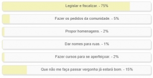 "O que um vereador deve fazer para honrar seu voto?" Enquete encerrada neste domingo não teve nem graça. Para 75% de quem votou o negócio é "legislar e fiscalizar". Só 5% foram de "fazer os pedidos da comunidade". Mas teve voto até para "propor homenagens" (2%) e "dar nome para ruas" (1%). Já para 15% "que não me faça passar vergonha já estará bom".
