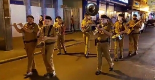 A Banda da Polícia Militar do Paraná realizou "caminhada musical" neste domingo à noite em Campo Mourão. Foi para comemorar os 166 anos da PMPR, que serão completados nesta segunda-feira. Os policiais-músicos saíram da praça São José e percorreram algumas quadras da av. Capitão Índio Bandeira. Antes, se apresentaram na Santa Casa. Tudo transmitido ao vivo por redes sociais.